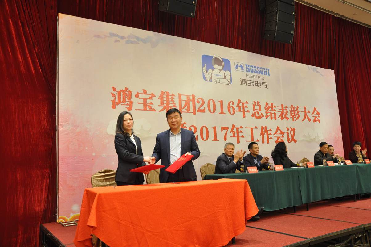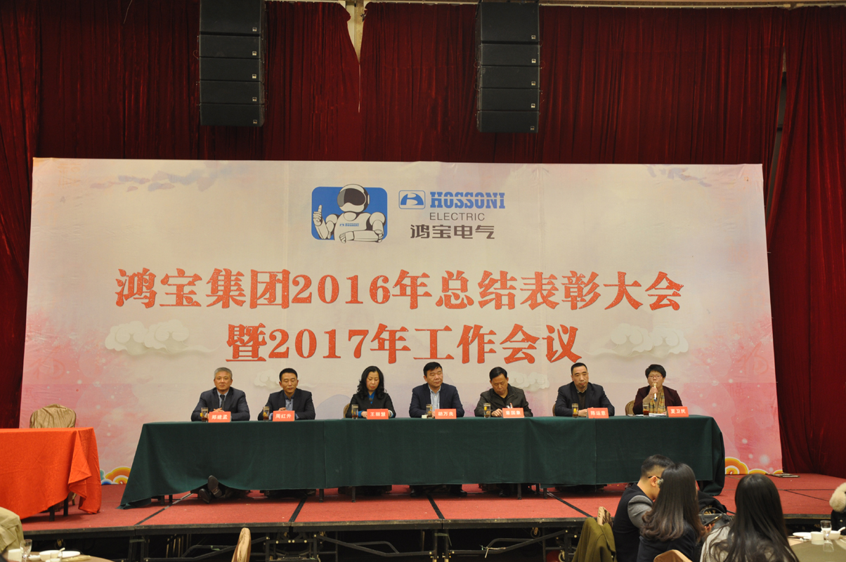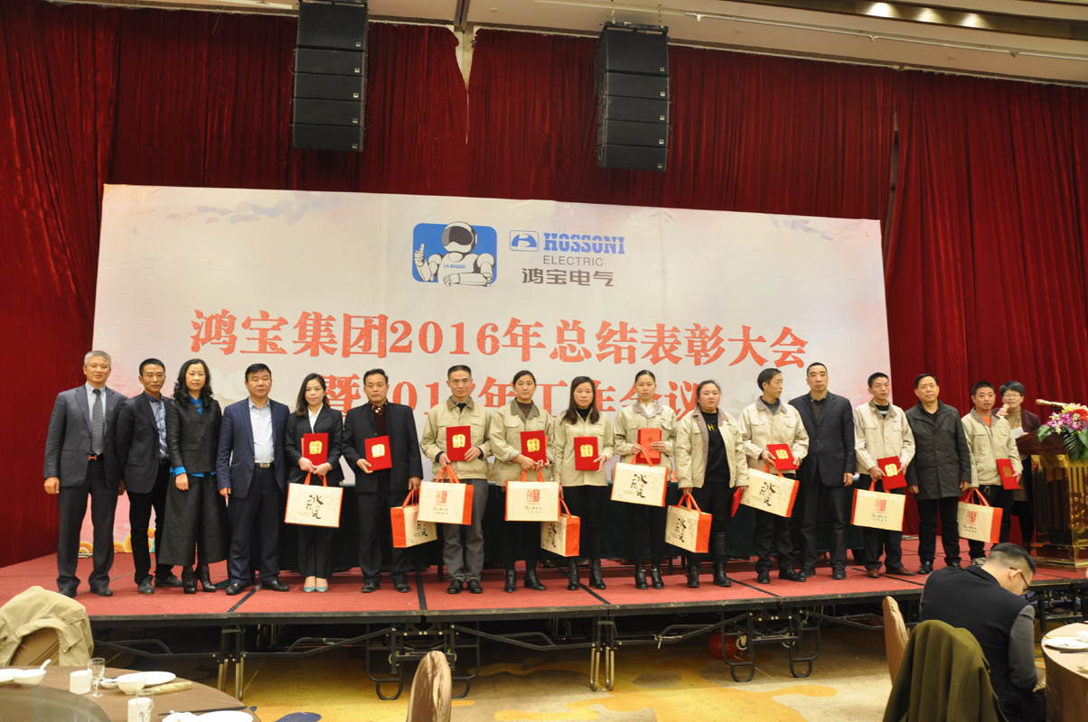 1月15日下午,鴻寶電氣集團(tuán)在柳市新新雅假日大酒店貴賓樓A\B廳隆重召開2016年度總結(jié)表彰大會暨2017年工作會議。出席本次會議的領(lǐng)導(dǎo)有公司董事長、總經(jīng)理、副總經(jīng)理、監(jiān)事長、各部門主管及公司員工300余人參加會議。會議由辦公室主任夏為民主持,會議在莊嚴(yán)神圣的國歌聲中拉開了序幕,公司監(jiān)事長王麗慧為大會致詞,生產(chǎn)副總經(jīng)理周紅升宣讀了表彰文件,公司隆重表彰了10位優(yōu)秀員工,銷售部陳蓮蓮和黨員鄭永忠代表優(yōu)秀員工和優(yōu)秀黨員做了發(fā)言,技術(shù)副總經(jīng)理陳運意就如何提升產(chǎn)品質(zhì)量做了詳細(xì)的質(zhì)量報告,總經(jīng)理章國象認(rèn)真客觀地總結(jié)了公司2016年的工作取得的成績和榮譽,并提出了2017年工作目標(biāo)和計劃。會議上董事長胡萬良分別與生產(chǎn)副總經(jīng)理周紅升、技術(shù)副總經(jīng)理陳運意和銷售代表陳蓮蓮分別簽訂了安全生產(chǎn)管理協(xié)議、質(zhì)量管理協(xié)議和銷售考核協(xié)議。最后董事長胡萬良作了重要講話,他對集團(tuán)公司2016年的工作做了具體的評價,并指出2016年,我們面對世界經(jīng)濟疲軟,國內(nèi)外市場復(fù)雜嚴(yán)峻等不利因素,全體員工團(tuán)結(jié)一致,不斷進(jìn)取,逆勢而上,保持了企業(yè)平穩(wěn)發(fā)展。同時,胡董提出:在新的一年, 全體員工要做到不因成績而驕傲,不因挫折而氣餒,我們要有同一個信念,目標(biāo)一致,做到有目標(biāo)、有計劃、有實施、有檢查、有監(jiān)督、有結(jié)果,他對大會提出了七點意見和要求,他指出全體員工要以百折不撓的精神從團(tuán)隊合作、提高生產(chǎn)效率、狠抓產(chǎn)品質(zhì)量、全力開拓新市場等方面要求員工堅定信心,團(tuán)結(jié)一致,攻堅克難,再創(chuàng)鴻寶新的輝煌。