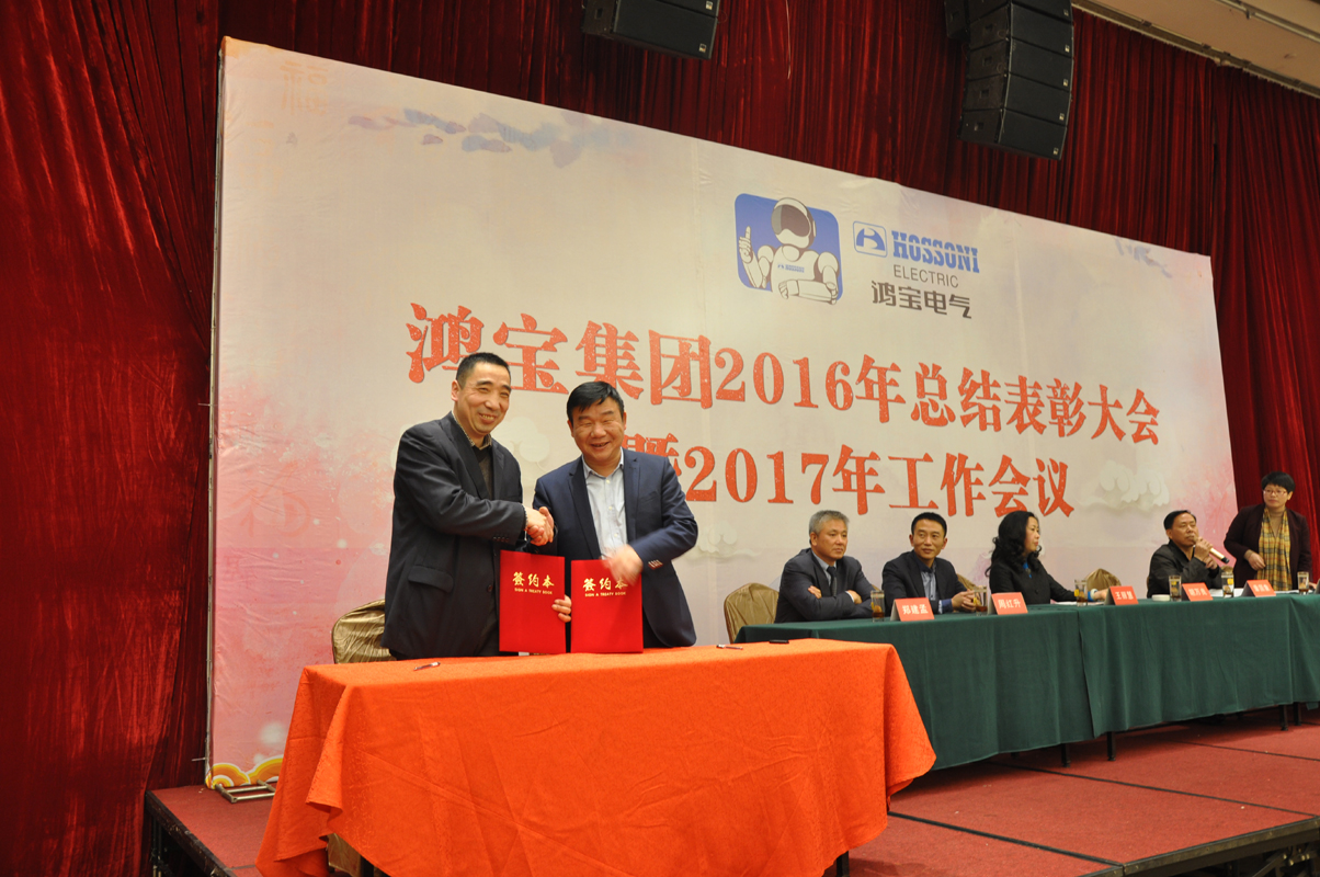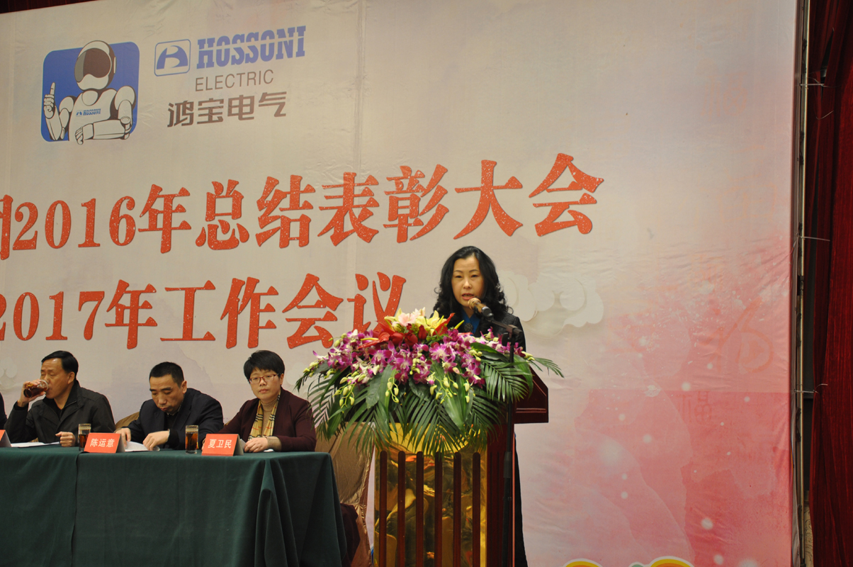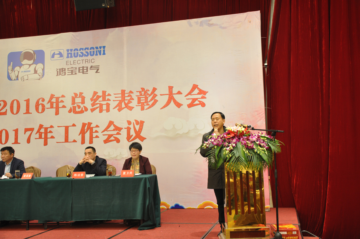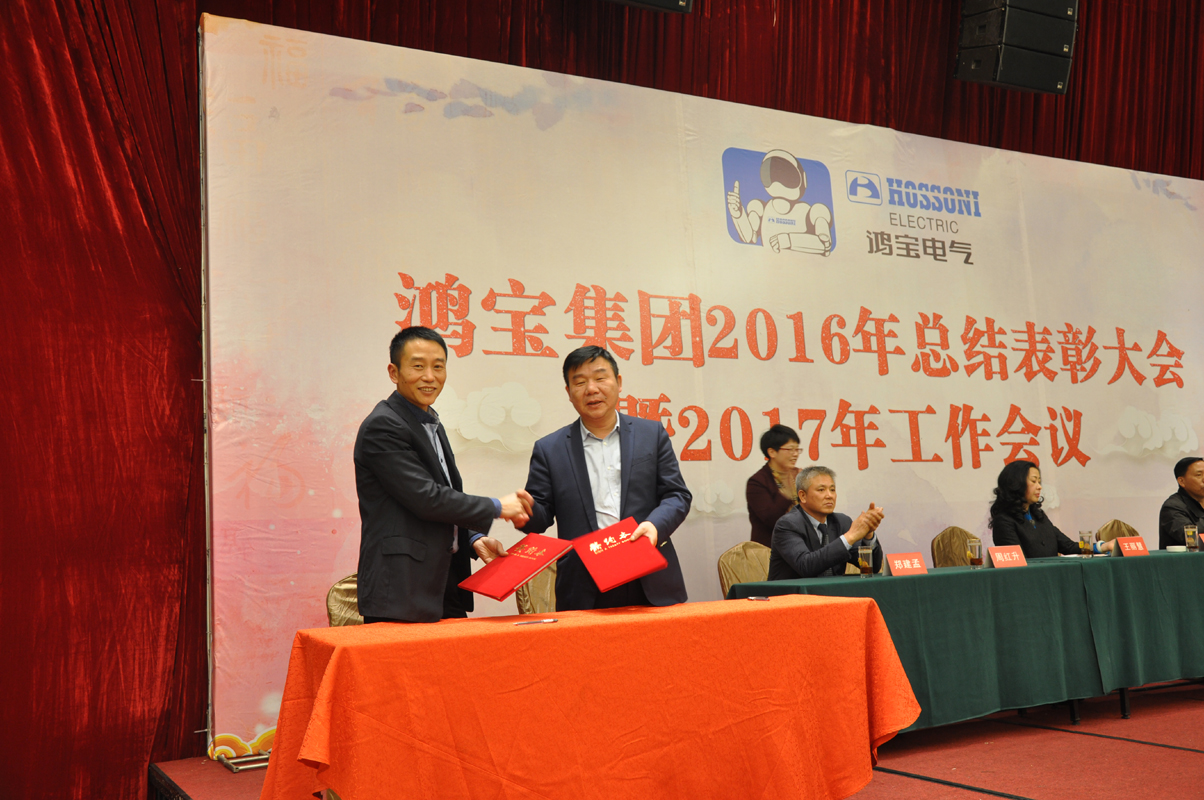 1月15日下午,鴻寶電氣集團(tuán)在柳市新新雅假日大酒店貴賓樓A\B廳隆重召開2016年度總結(jié)表彰大會暨2017年工作會議。出席本次會議的領(lǐng)導(dǎo)有公司董事長、總經(jīng)理、副總經(jīng)理、監(jiān)事長、各部門主管及公司員工300余人參加會議。會議由辦公室主任夏為民主持,會議在莊嚴(yán)神圣的國歌聲中拉開了序幕,公司監(jiān)事長王麗慧為大會致詞,生產(chǎn)副總經(jīng)理周紅升宣讀了表彰文件,公司隆重表彰了10位優(yōu)秀員工,銷售部陳蓮蓮和黨員鄭永忠代表優(yōu)秀員工和優(yōu)秀黨員做了發(fā)言,技術(shù)副總經(jīng)理陳運意就如何提升產(chǎn)品質(zhì)量做了詳細(xì)的質(zhì)量報告,總經(jīng)理章國象認(rèn)真客觀地總結(jié)了公司2016年的工作取得的成績和榮譽,并提出了2017年工作目標(biāo)和計劃。會議上董事長胡萬良分別與生產(chǎn)副總經(jīng)理周紅升、技術(shù)副總經(jīng)理陳運意和銷售代表陳蓮蓮分別簽訂了安全生產(chǎn)管理協(xié)議、質(zhì)量管理協(xié)議和銷售考核協(xié)議。最后董事長胡萬良作了重要講話,他對集團(tuán)公司2016年的工作做了具體的評價,并指出2016年,我們面對世界經(jīng)濟疲軟,國內(nèi)外市場復(fù)雜嚴(yán)峻等不利因素,全體員工團(tuán)結(jié)一致,不斷進(jìn)取,逆勢而上,保持了企業(yè)平穩(wěn)發(fā)展。同時,胡董提出:在新的一年, 全體員工要做到不因成績而驕傲,不因挫折而氣餒,我們要有同一個信念,目標(biāo)一致,做到有目標(biāo)、有計劃、有實施、有檢查、有監(jiān)督、有結(jié)果,他對大會提出了七點意見和要求,他指出全體員工要以百折不撓的精神從團(tuán)隊合作、提高生產(chǎn)效率、狠抓產(chǎn)品質(zhì)量、全力開拓新市場等方面要求員工堅定信心,團(tuán)結(jié)一致,攻堅克難,再創(chuàng)鴻寶新的輝煌。
