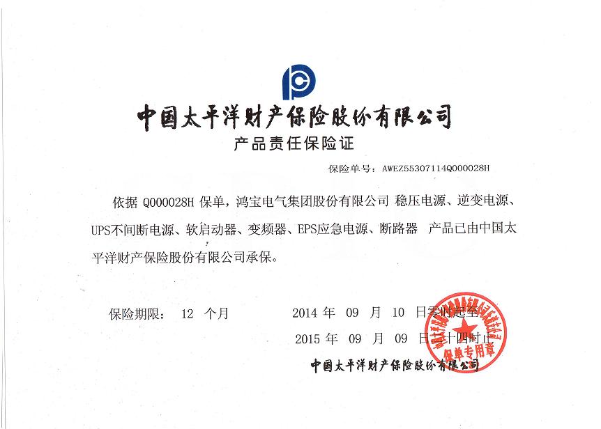 本報(bào)訊:依據(jù)Q000028H 保單,鴻寶電氣集團(tuán)股份有限公司 穩(wěn)壓電源、逆變電源、UPS不間斷電源、軟啟動(dòng)器、變頻器、EPS應(yīng)急電源、斷路器 產(chǎn)品已由中國(guó)太平洋財(cái)產(chǎn)保險(xiǎn)股份有限公司承保。