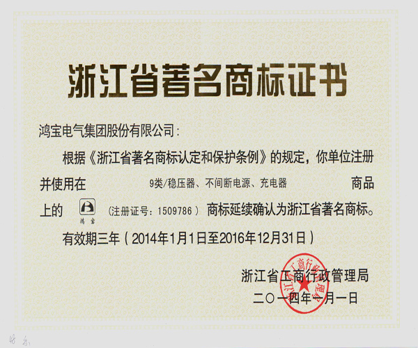 鴻寶商標自2004年被評為“浙江省著名商標”以來,憑借良好的市場知名度、美譽度及優(yōu)越的產(chǎn)品品質(zhì)和品牌價值,再次被延續(xù)確認為“浙江省著名商標”。